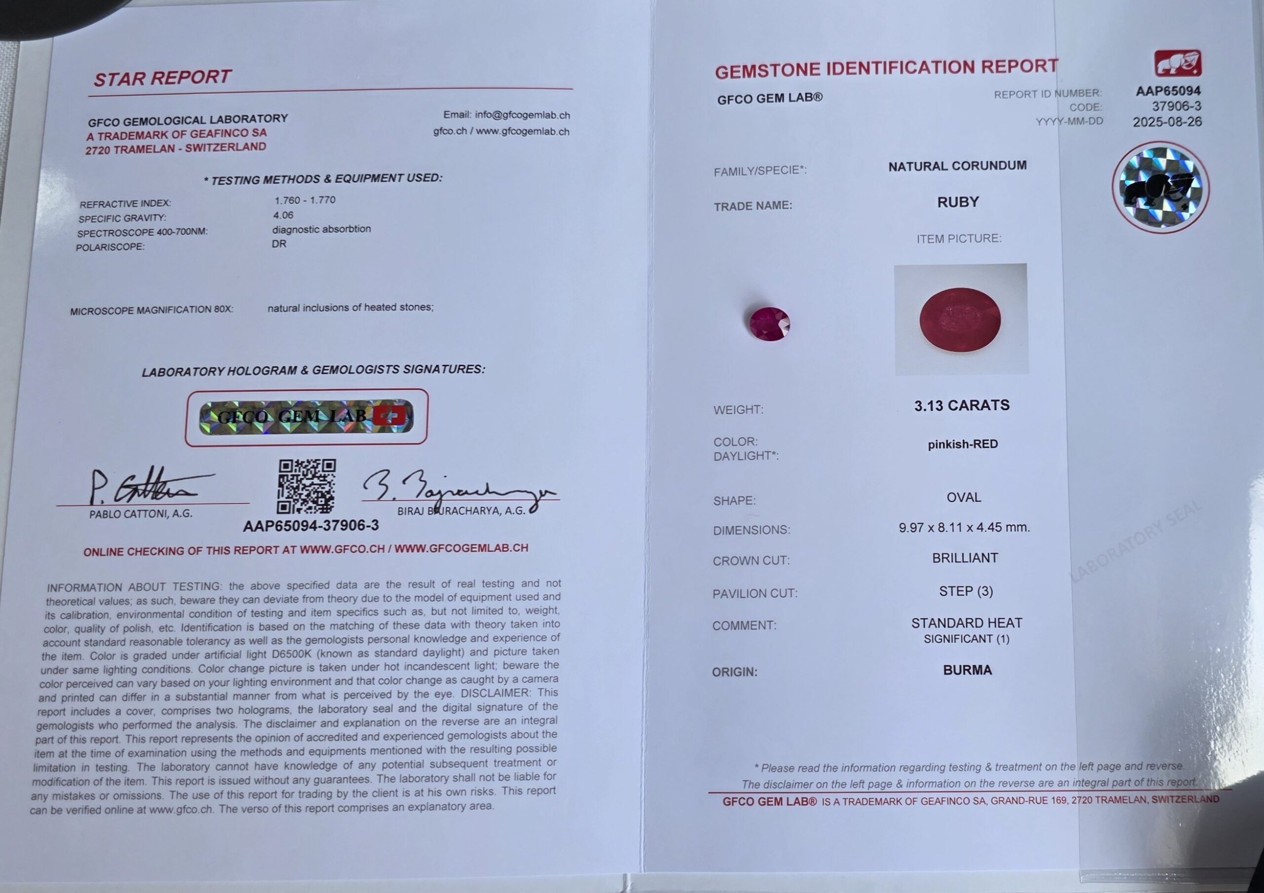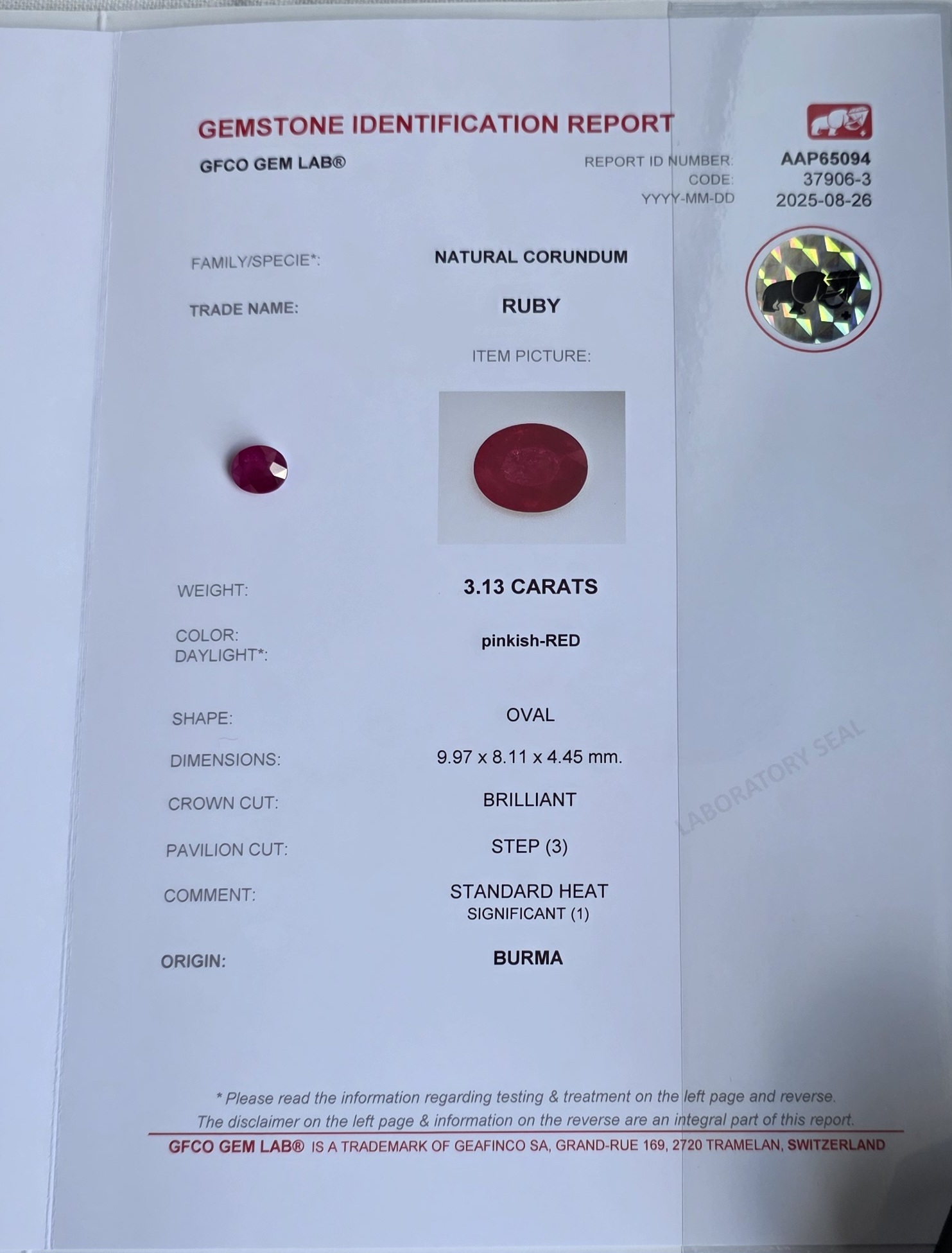 Certification: GFCO Gem Lab Report No. AAP65094-37906-3
