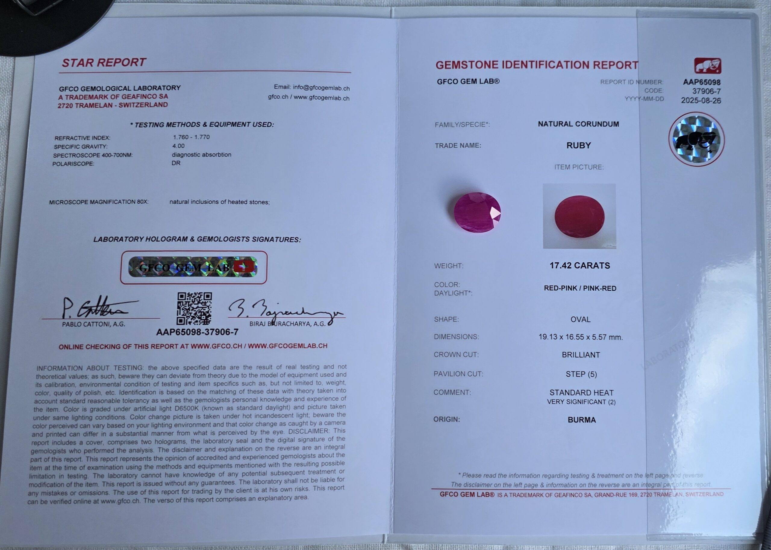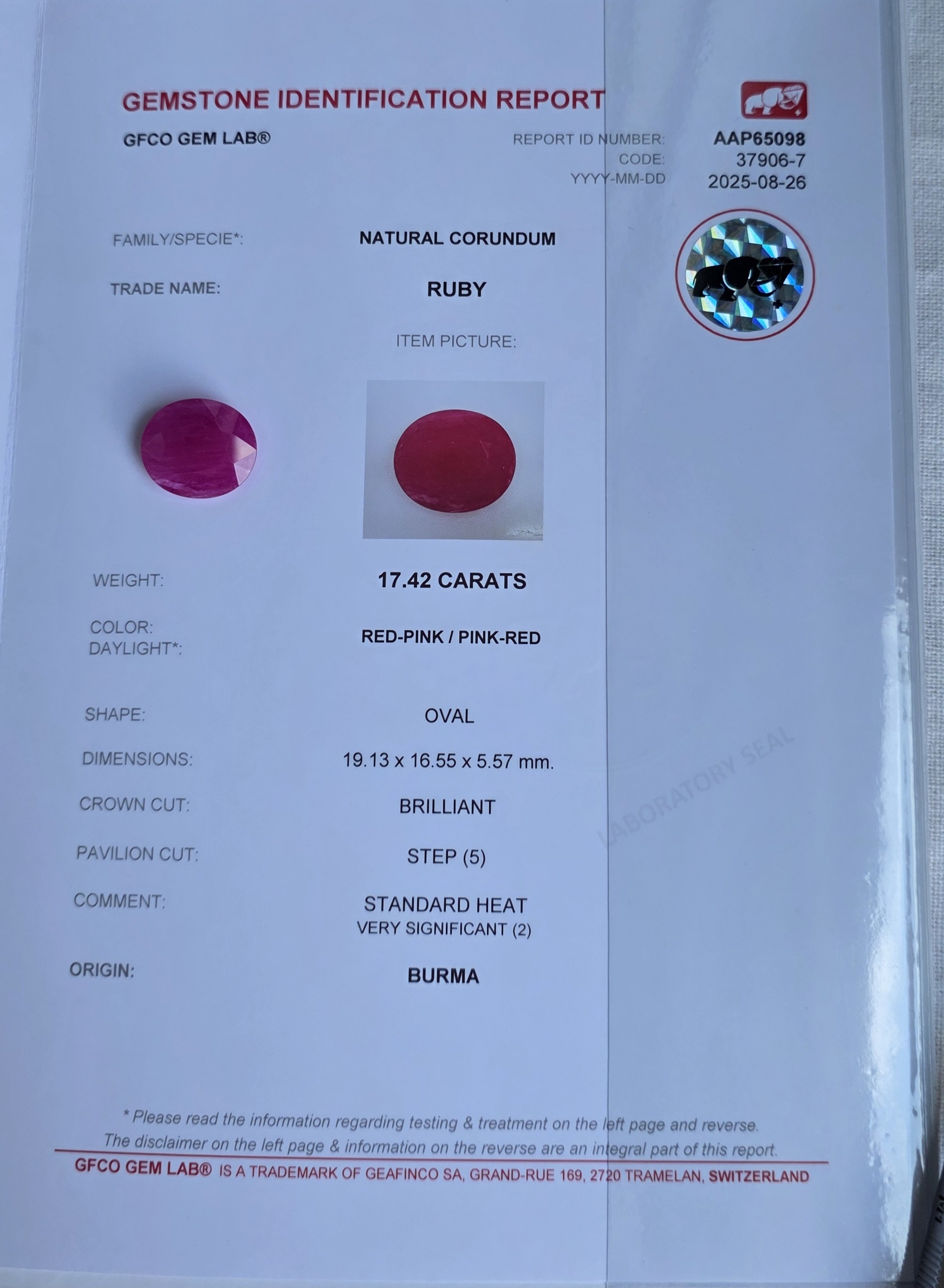 Certification: GFCO Gem Lab Report No. AAP65097-37906-6