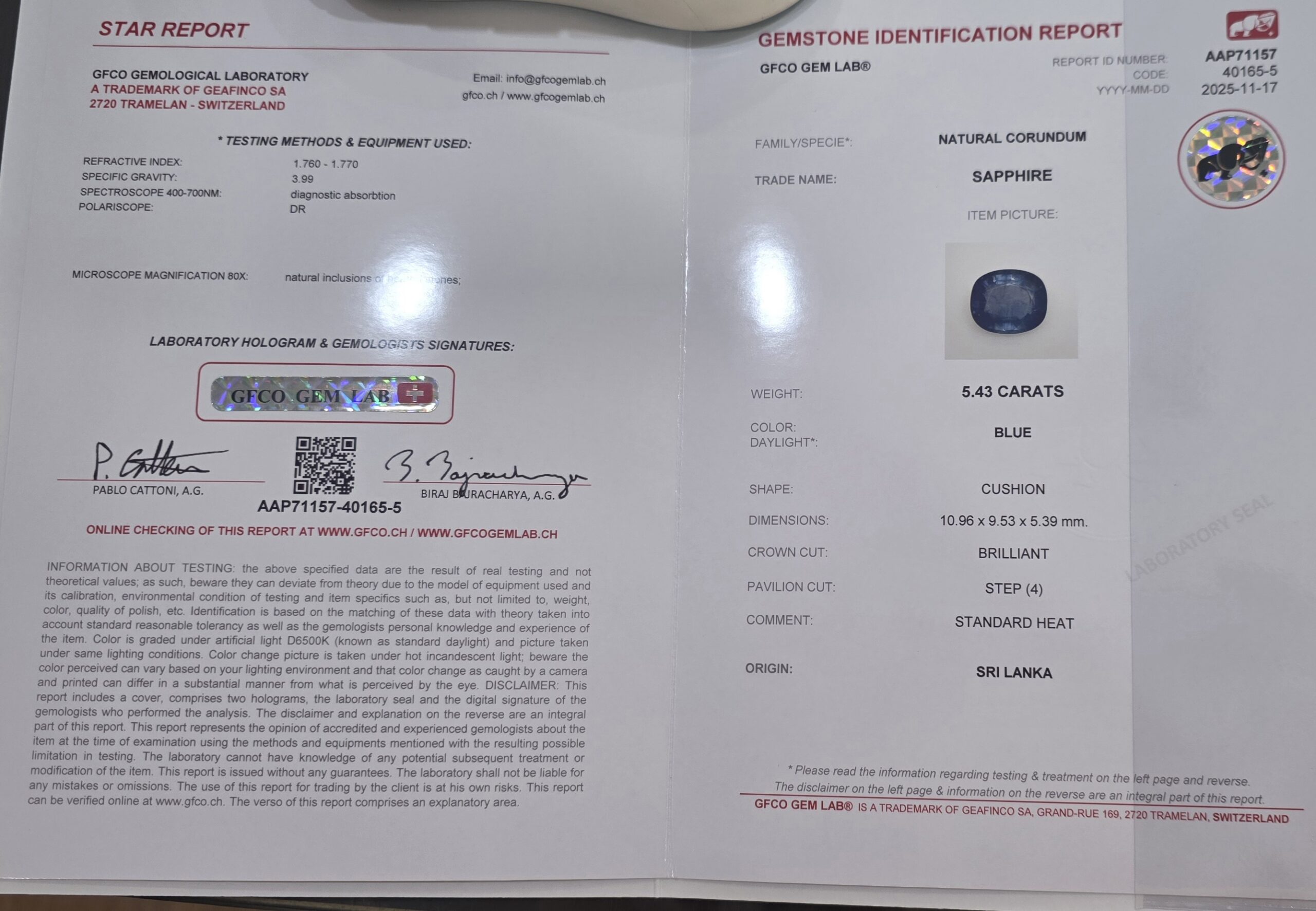 Experience the brilliance of this Natural Blue Sapphire, weighing 5.43 carats with dimensions 10.96 × 9.53 × 5.39 mm. Mined from the prestigious gem fields of Sri Lanka (Ceylon), this sapphire showcases a rich royal-blue hue prized for its exceptional clarity and luster.