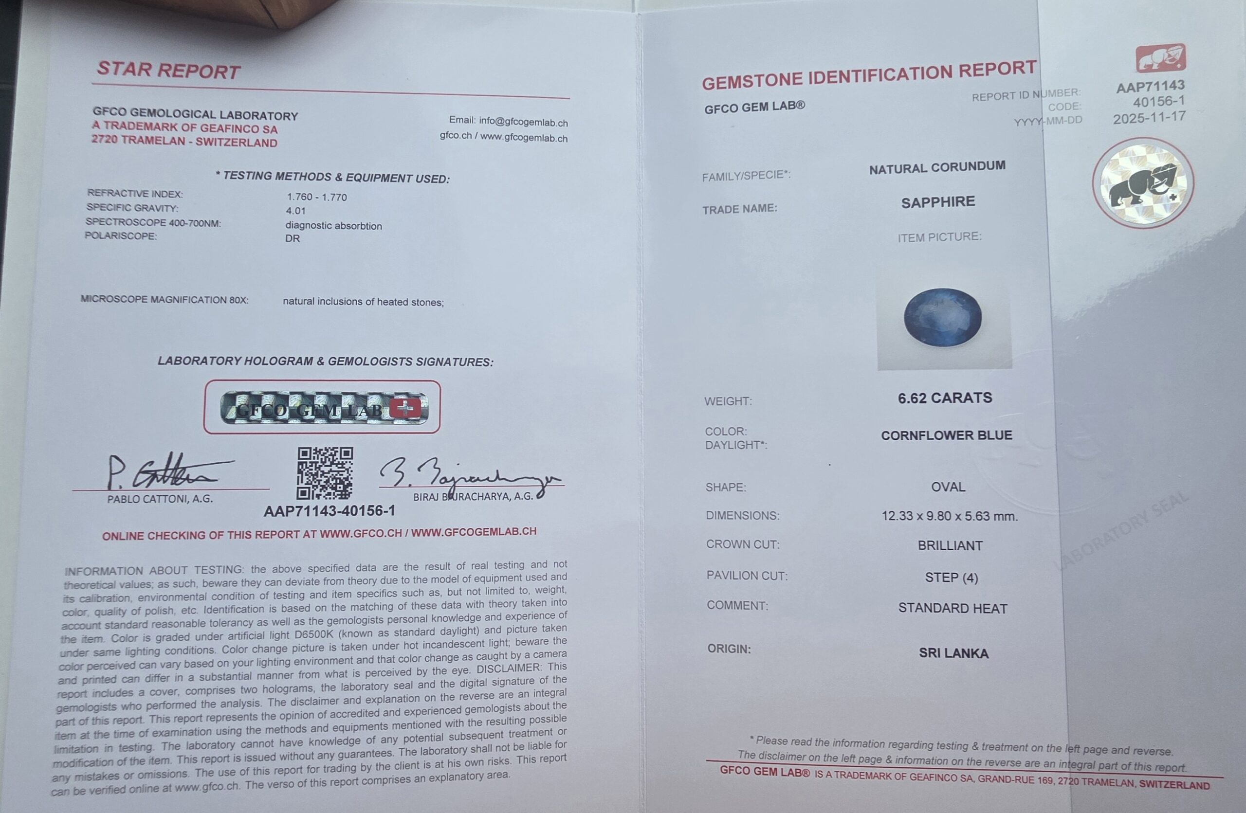 This premium Natural Blue Sapphire (Neelam) weighs 6.62 carats and features dimensions of 12.33 × 9.80 × 5.63 mm. Mined from the renowned gemstone deposits of Sri Lanka (Ceylon), this sapphire showcases a vivid royal-blue color with excellent luster and clarity.