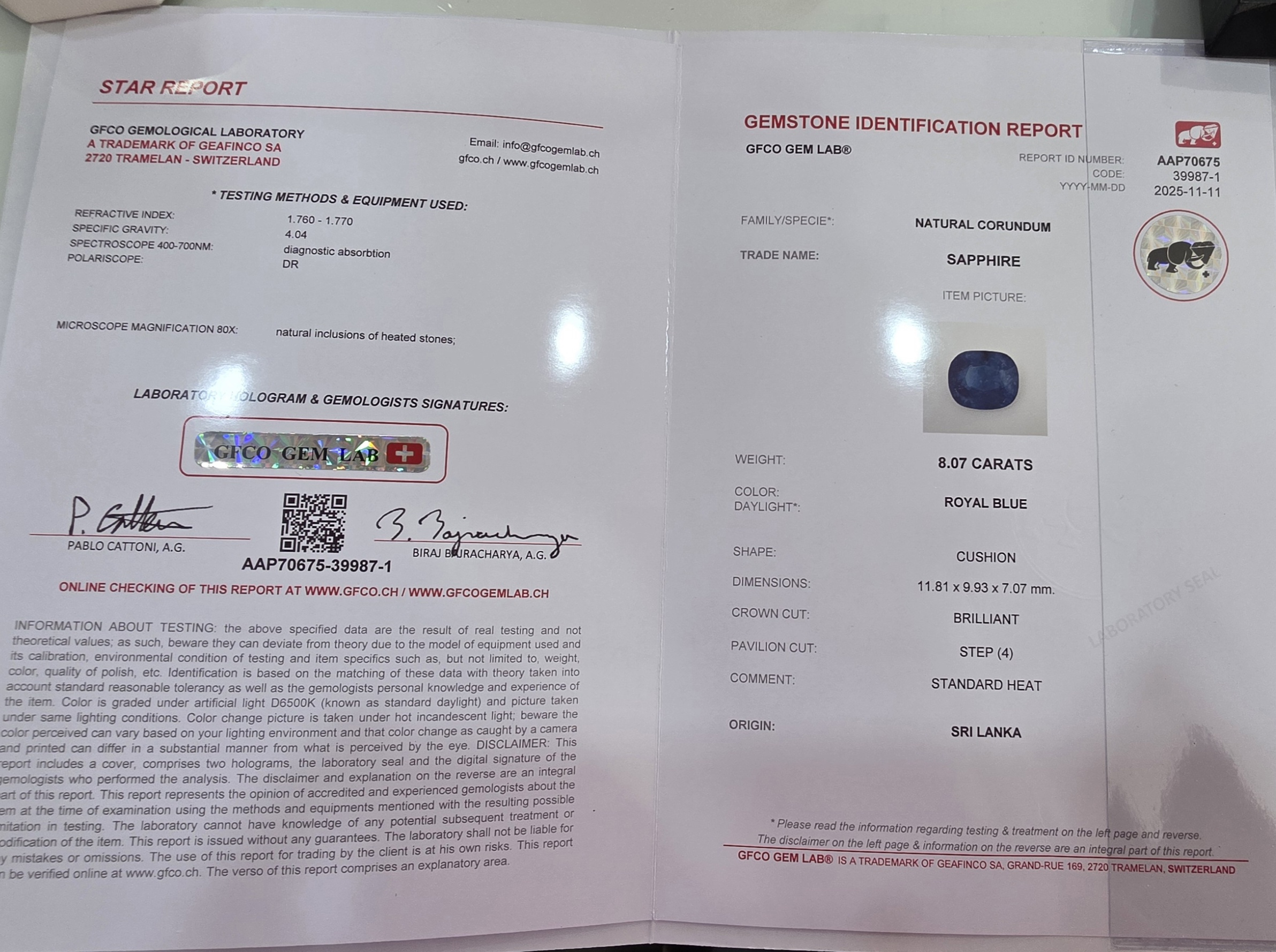 This premium Natural Blue Sapphire weighs 8.07 carats and is beautifully cut in an oval shape with dimensions 11.81 × 9.93 × 7.07 mm. Sourced from Sri Lanka (Ceylon)—renowned for producing the world’s finest sapphires—this gemstone showcases a vivid royal-blue tone with excellent clarity and brilliance.
