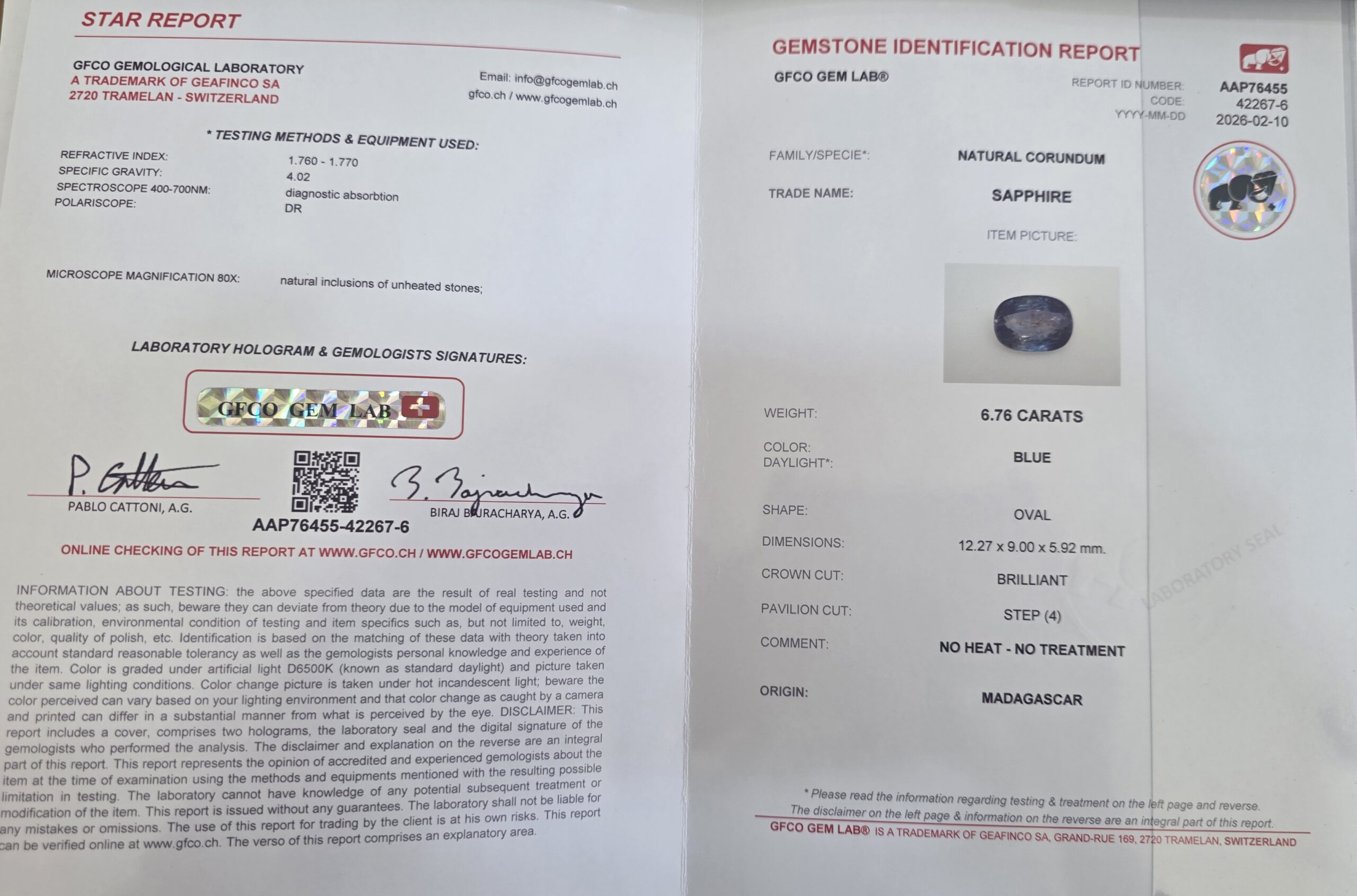 This Natural Unheated Blue Sapphire (Neelam) is a rare and powerful gemstone, weighing 6.76 carats and cut in an elegant oval shape measuring 12.27 × 9.00 × 5.92 mm. Mined from Madagascar, this sapphire is 100% natural with no heat or treatment, preserving its original color, crystal structure, and metaphysical energy.