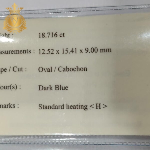 Weighing 18.716 carats and measuring 12.52 × 15.41 × 9 mm, this sapphire originates from Madagascar, a source renowned for producing corundum with strong color and durability. The stone has undergone heat treatment, a widely accepted enhancement used to improve color and clarity while maintaining natural authenticity.