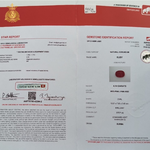 This exquisite 4.14 carat natural ruby sapphire showcases a finely crafted oval cut, maximizing brilliance and fire. Sourced from the renowned mines of Burma, this gemstone displays rich saturation and superior quality.