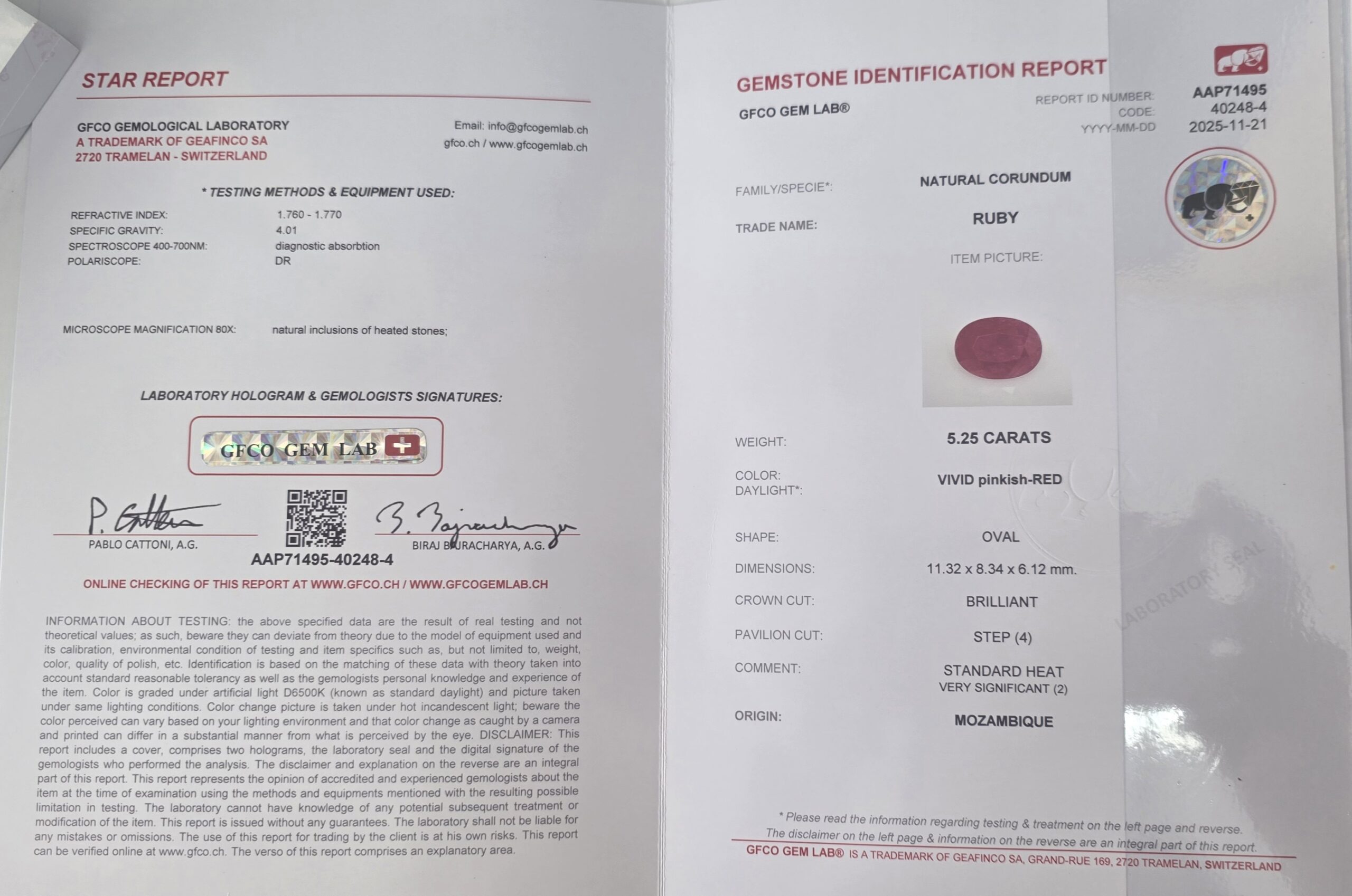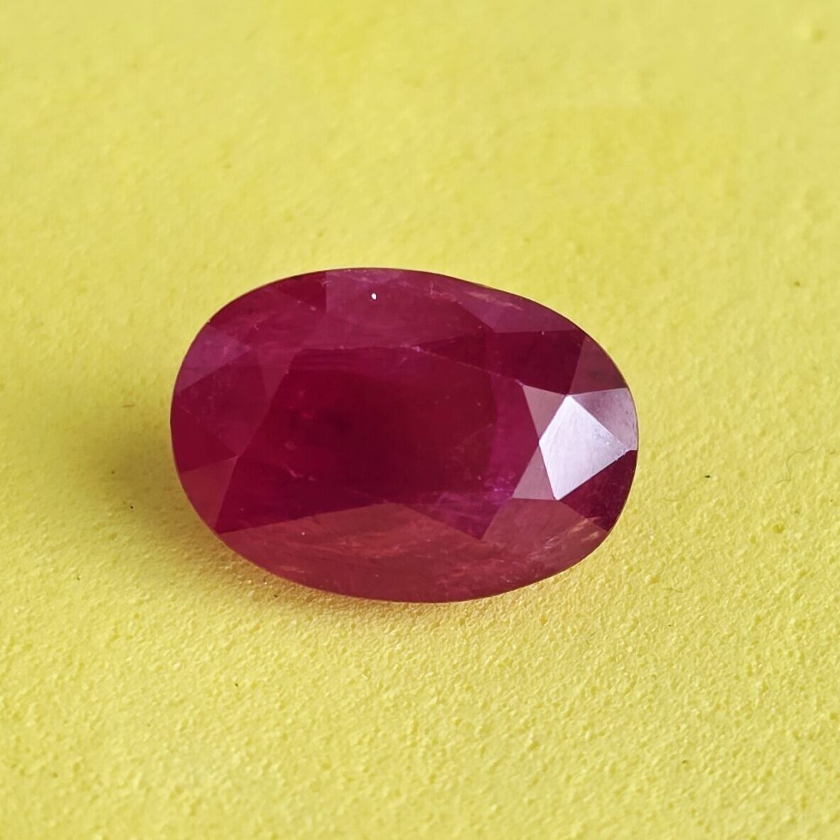 A rare and radiant 5.25 Carat Natural Mozambique Ruby, crafted in an elegant oval (dimensions 11.32 × 8.3 4× 6.12 mm) with a vivid red hue and stunning brilliance. This gemstone is ideal for fine jewelry and astrological use, representing both timeless beauty and powerful planetary energy.