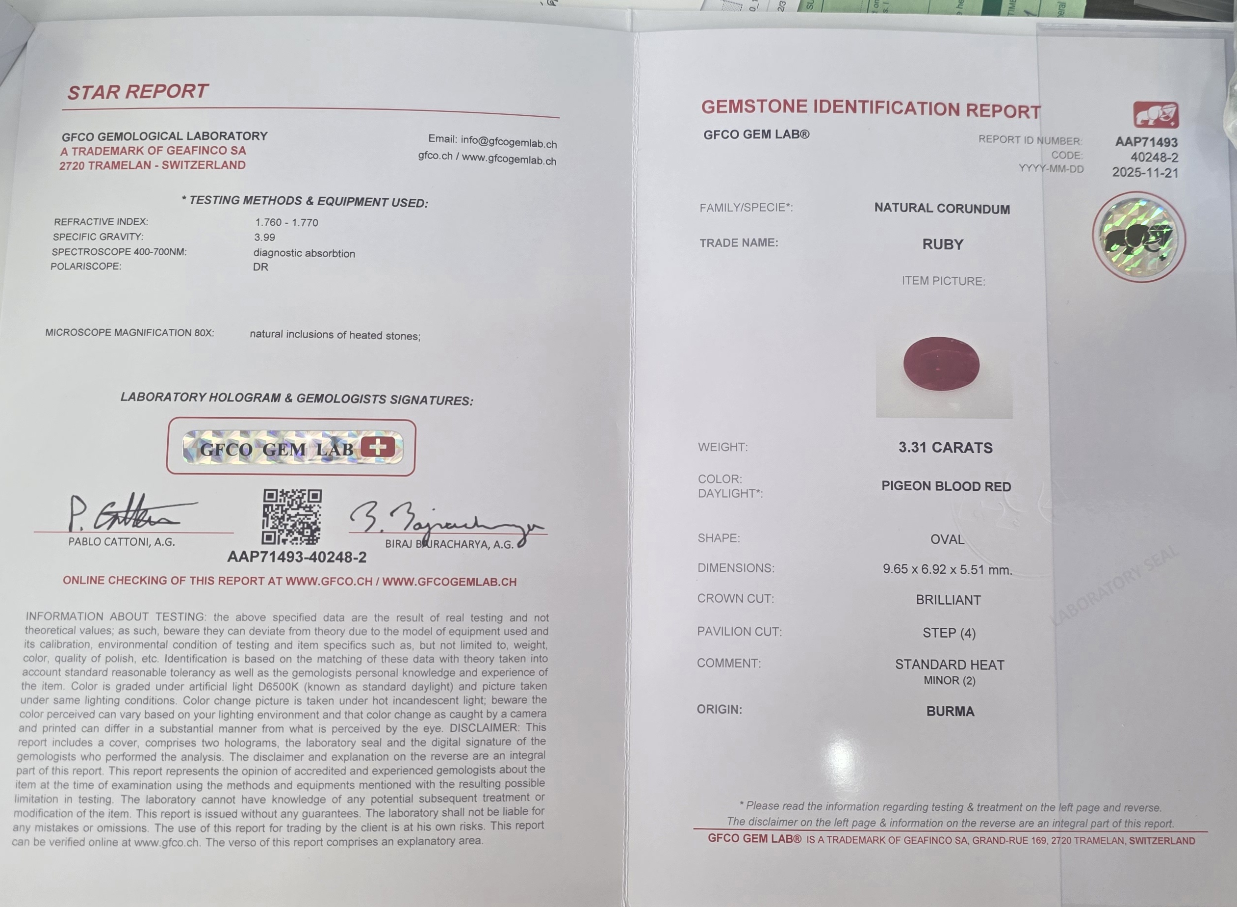 This exquisite Natural Ruby weighs 3.31 carats and features an elegant oval cut measuring 9.65 × 6.92 × 5.51 mm. Originating from Mozambique, this ruby displays a rich, vibrant red hue — symbolizing passion, power, and vitality.