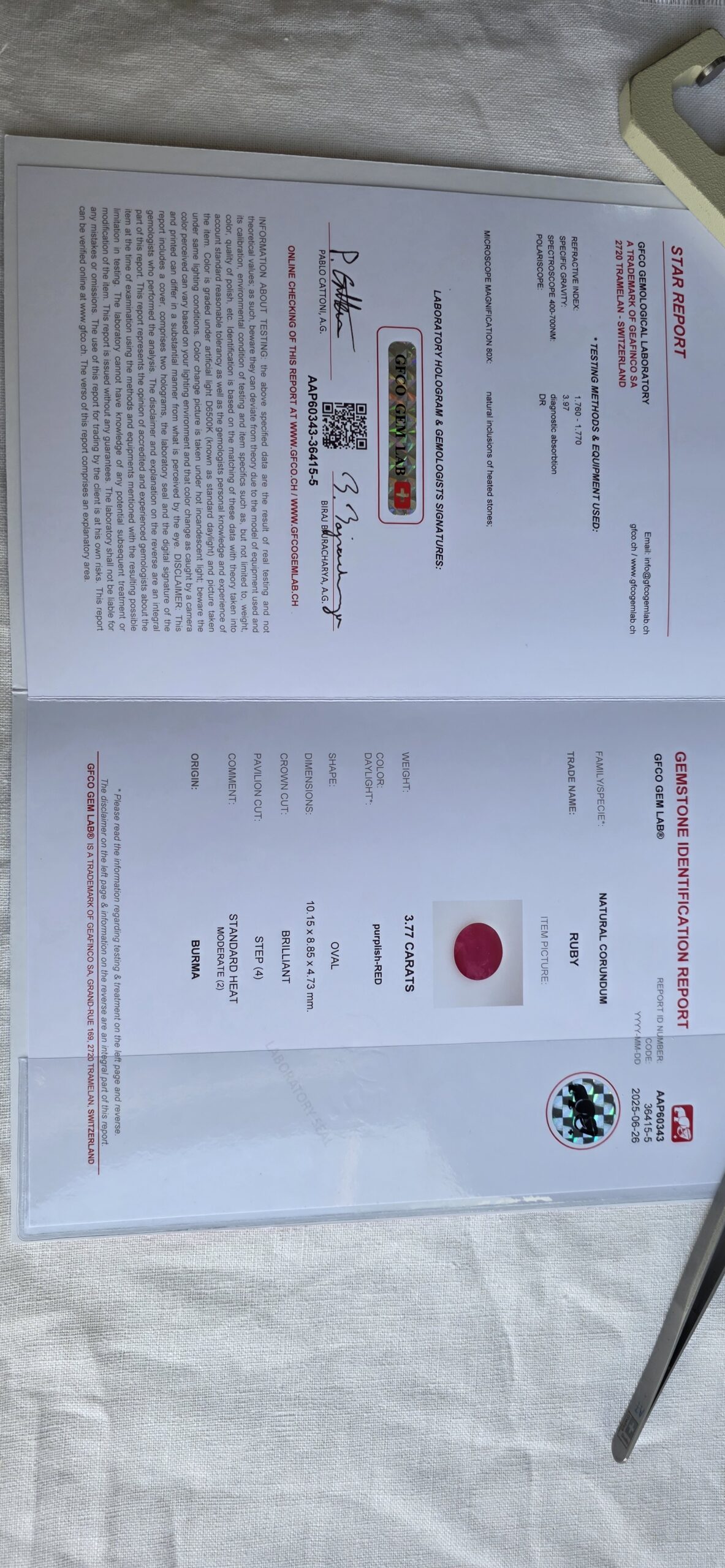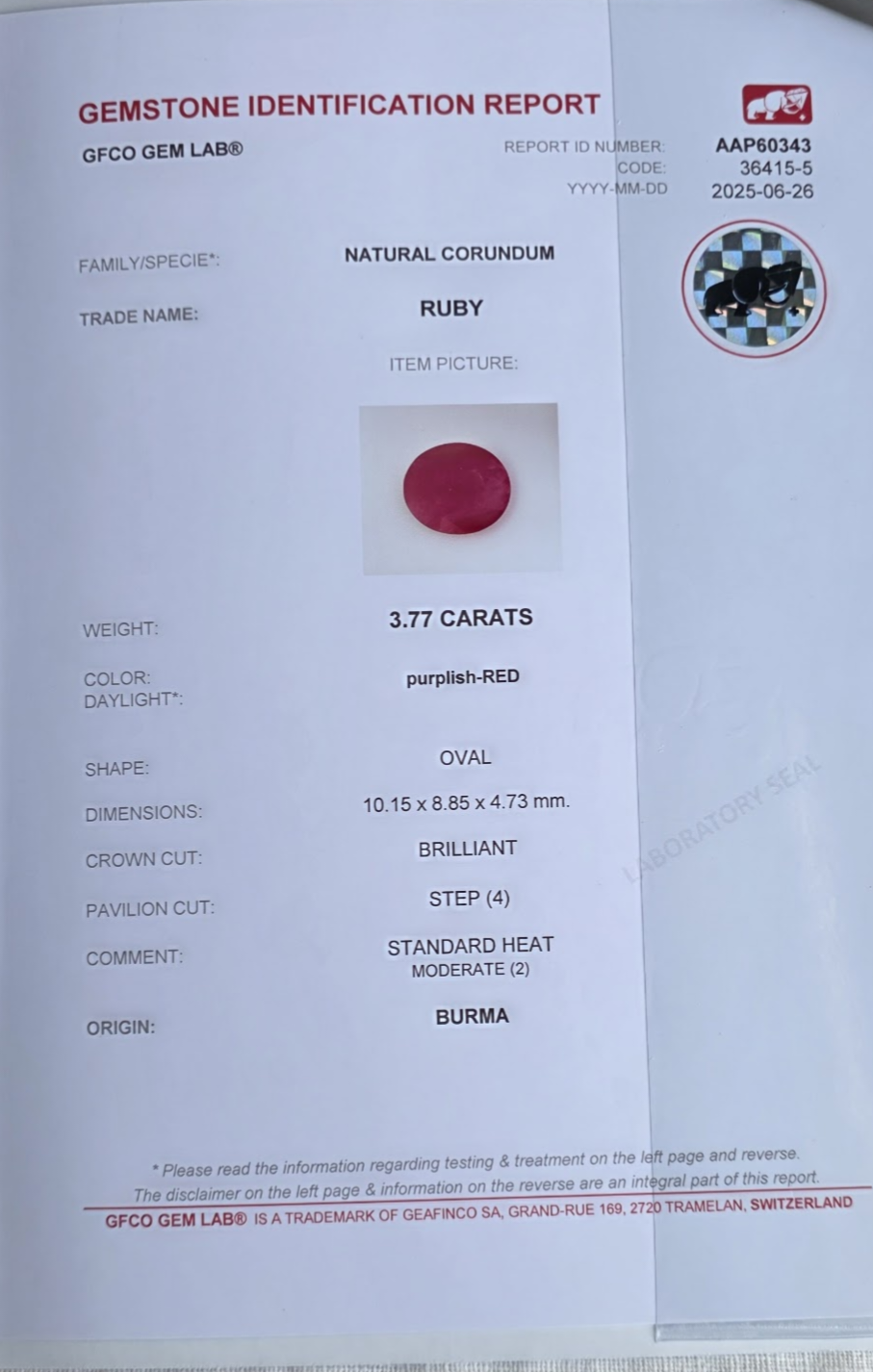 This exquisite Natural Ruby weighs 3.77 carats and is crafted in a classic oval cut. With dimensions of 10.15 × 8.85 × 4.73 mm, it hails from Burma (Myanmar), a world-renowned source of fine-quality rubies celebrated for their vivid color and brilliance.