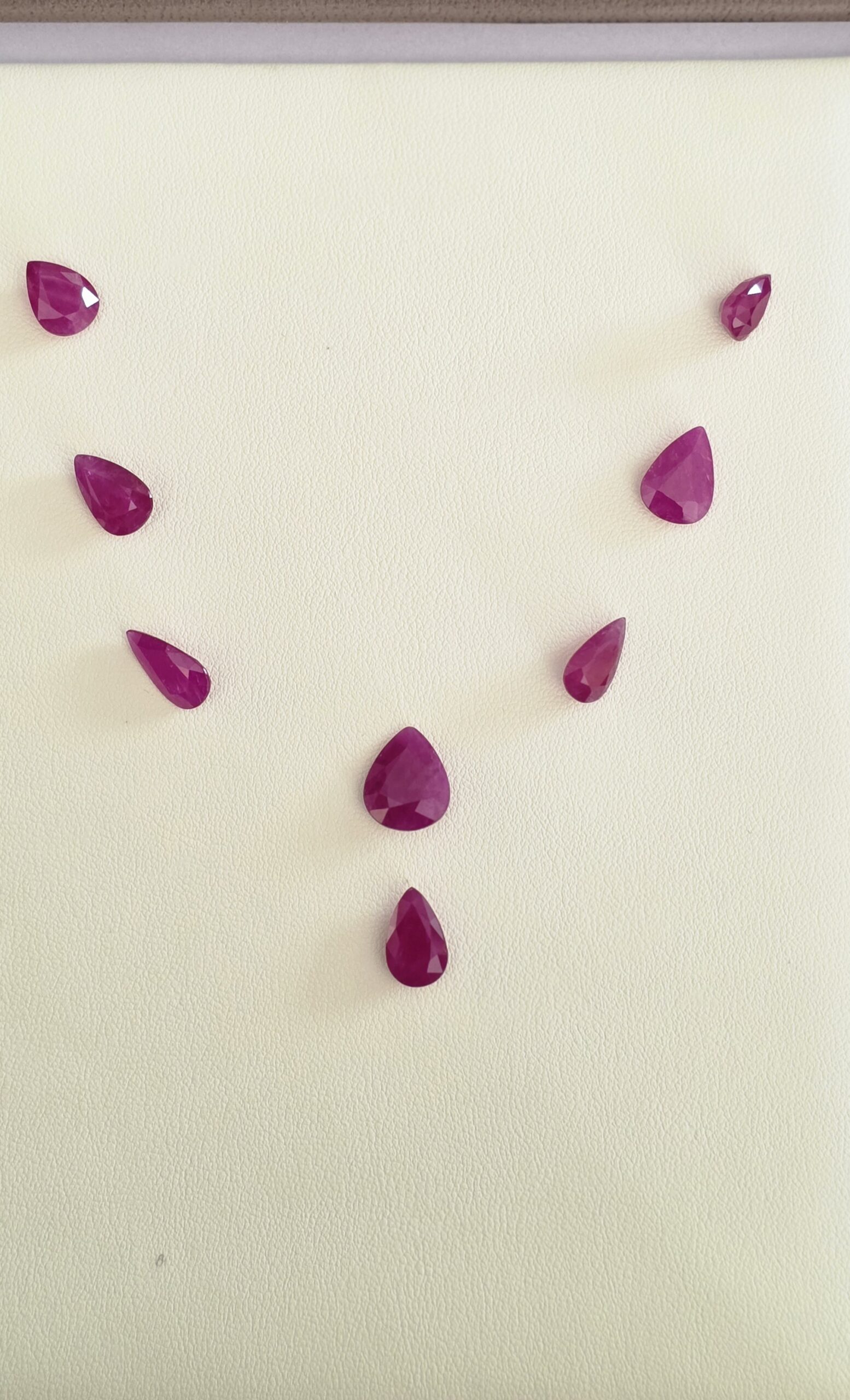 Natural Ruby Sapphire gemstones, totaling 26.76 carats and consisting of 8 beautifully matched pear-shaped pieces. Sourced from Mozambique, these gems display vibrant color, excellent clarity, and fine polishing—perfect for high-end jewelry making, collections, or investment.