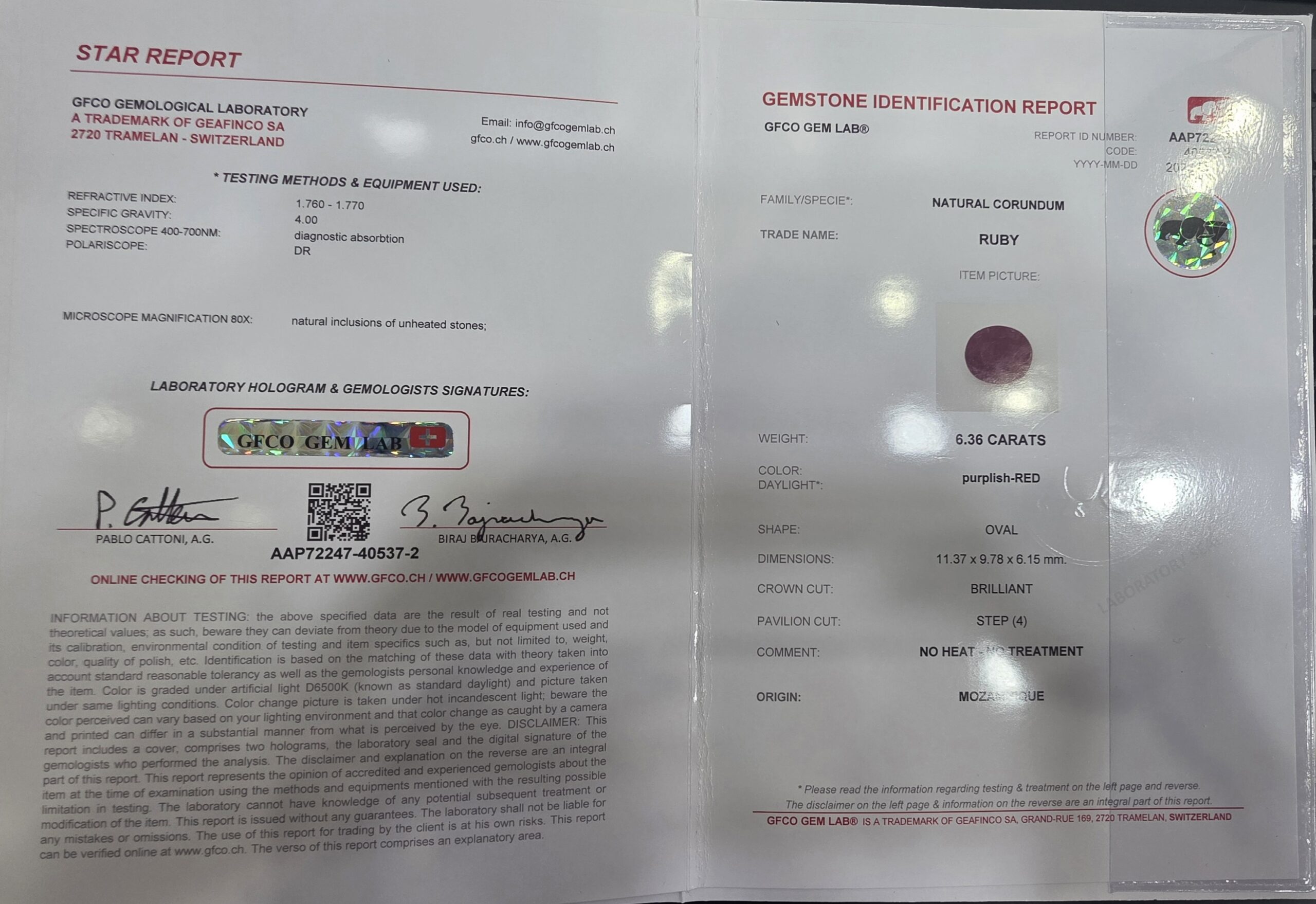Presenting a Natural Ruby Sapphire of exceptional beauty and rarity, sourced from Mozambique. This gemstone features a classic oval cut that enhances its natural brilliance and rich color. With a weight of 6.36 carats, it is a perfect choice for fine jewelry, collectors, and astrological purposes.
