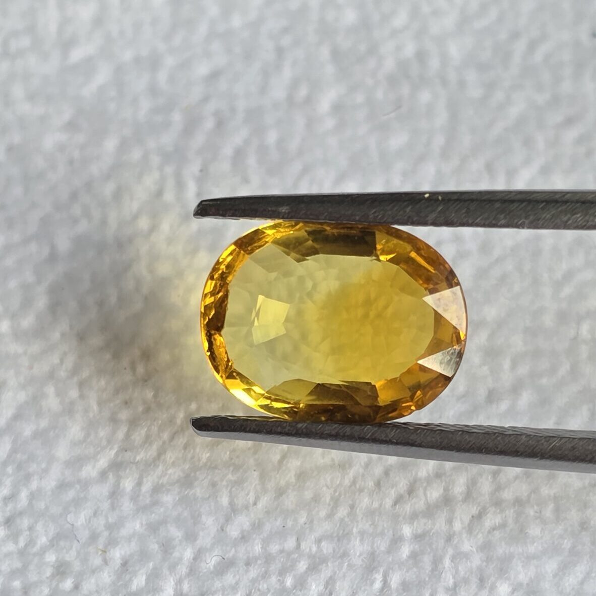 A stunning Natural Yellow Sapphire (Pukhraj) weighing 4.67 carats, expertly cut in an oval shape measuring 9.9 × 12 × 4 mm.