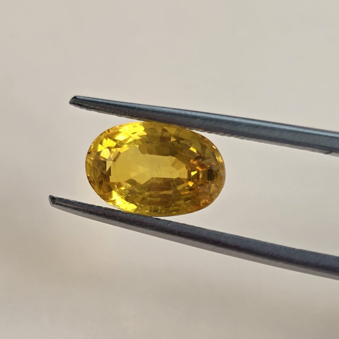 A brilliant Natural Yellow Sapphire (Pukhraj) weighing 4.86 carats, cut in an oval shape measuring 11.9 × 5.9 × 7.4 mm.