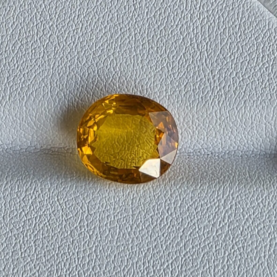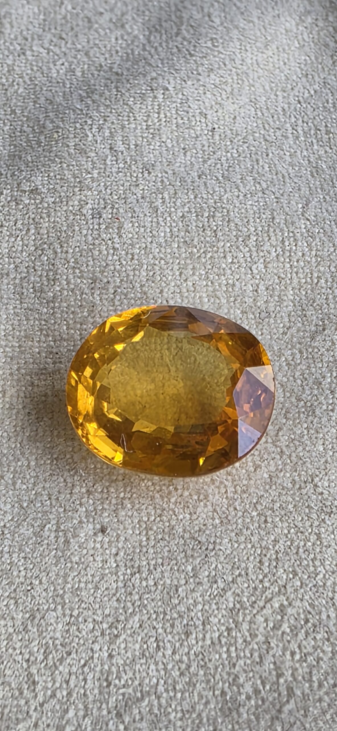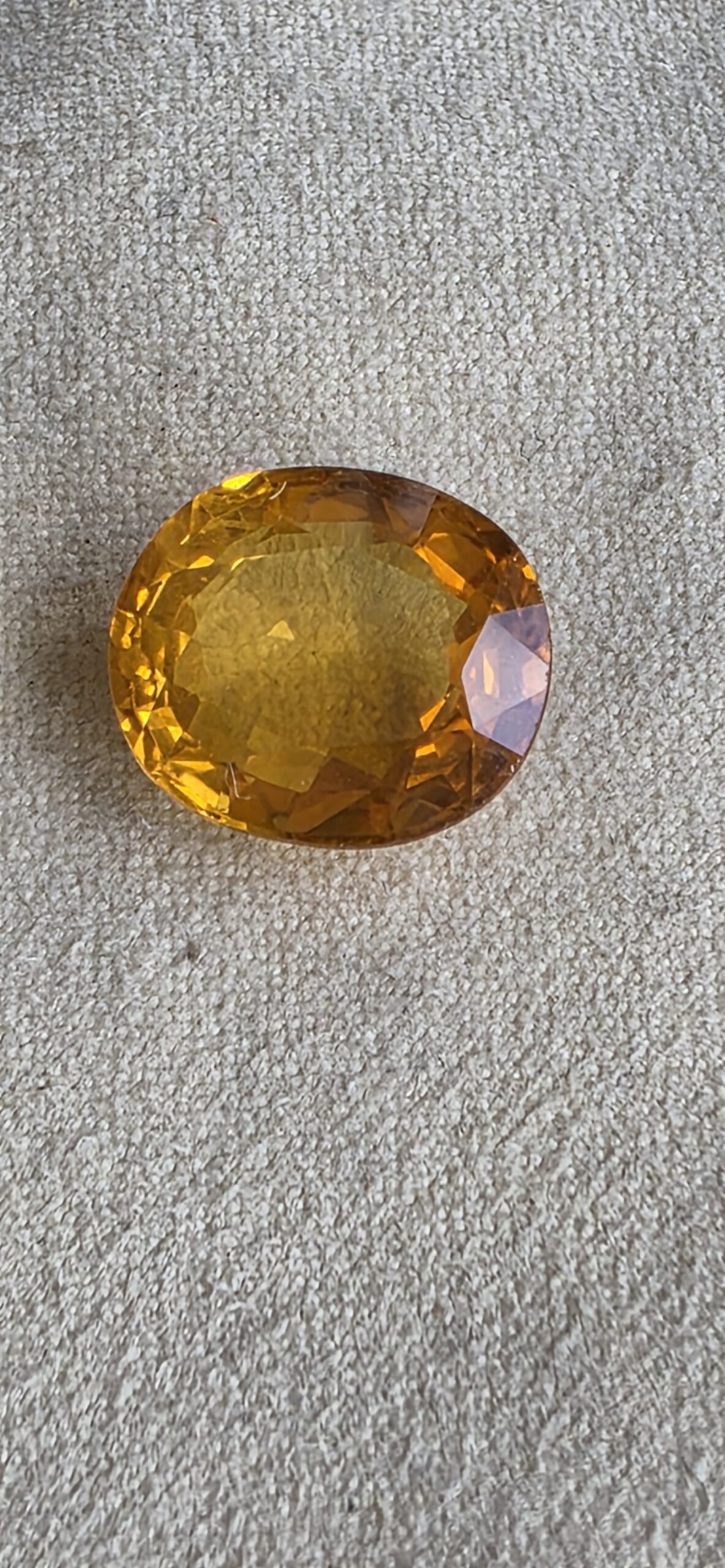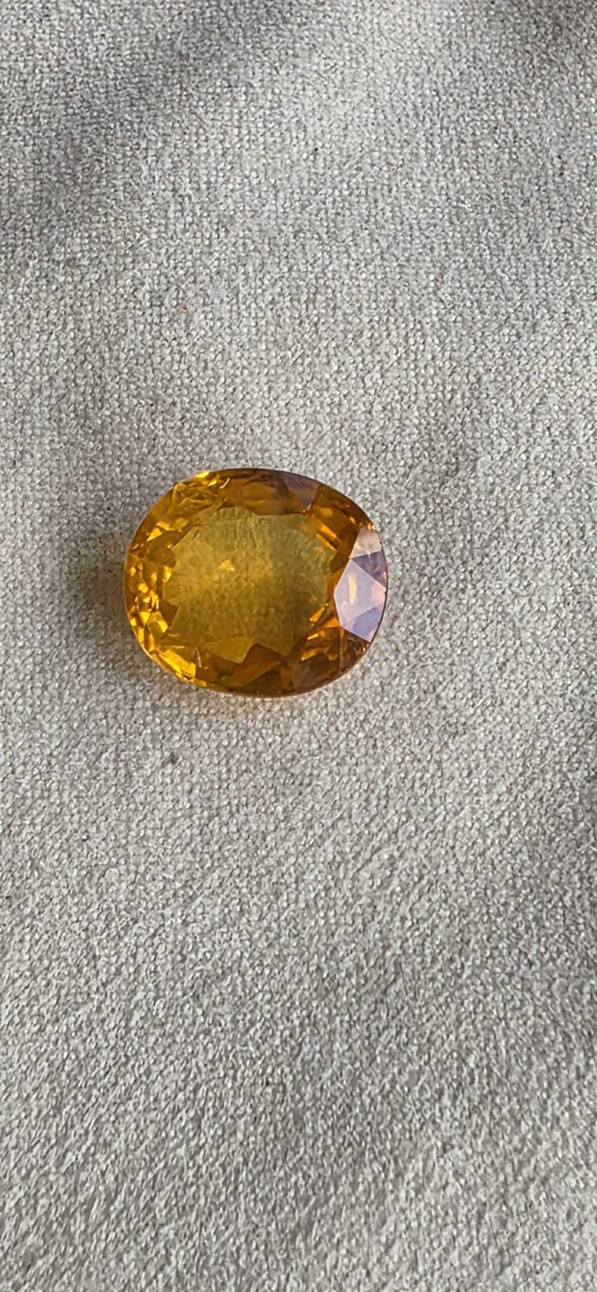 A beautiful Natural Yellow Sapphire (Pukhraj) weighing 5.77 carats, expertly cut in a classic oval shape measuring 11.9*6.8*8.7 mm.