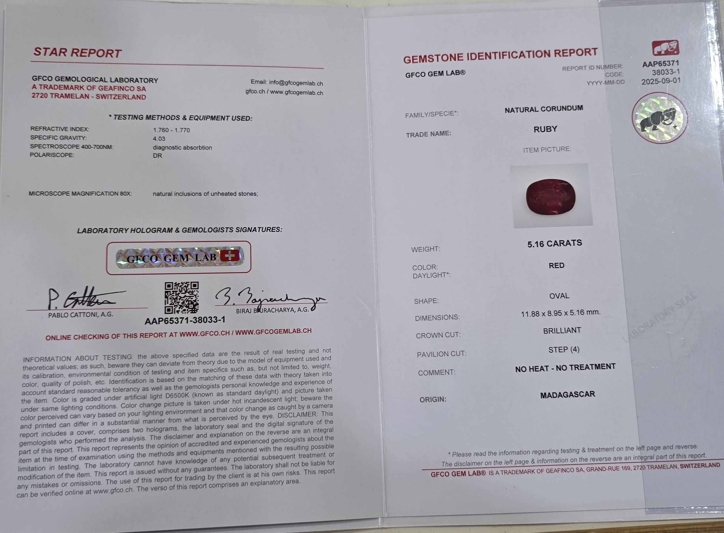 Discover the beauty of this natural unheated Madagascar ruby, weighing 5.16 carats and cut in an elegant oval shape measuring 11.88 × 8.95 × 5.16 mm. Certified for authenticity, this ruby features a vivid red hue and excellent clarity, making it an ideal choice for fine jewelry. In astrology, this stone is said to bring vitality, courage, and positive energy to its wearer. Perfect for rings, pendants, or custom jewelry, this ruby combines natural elegance, value, and spiritual significance.